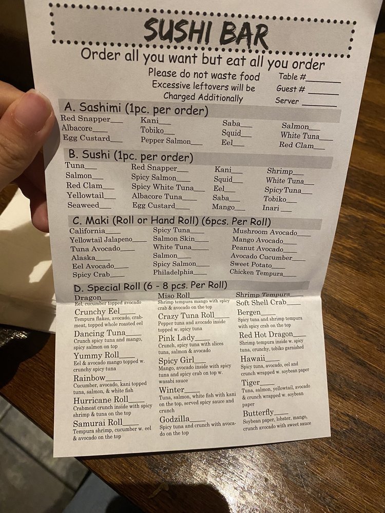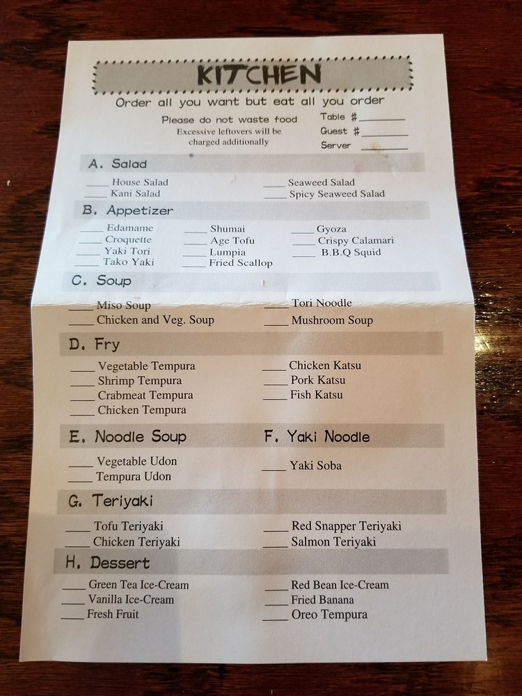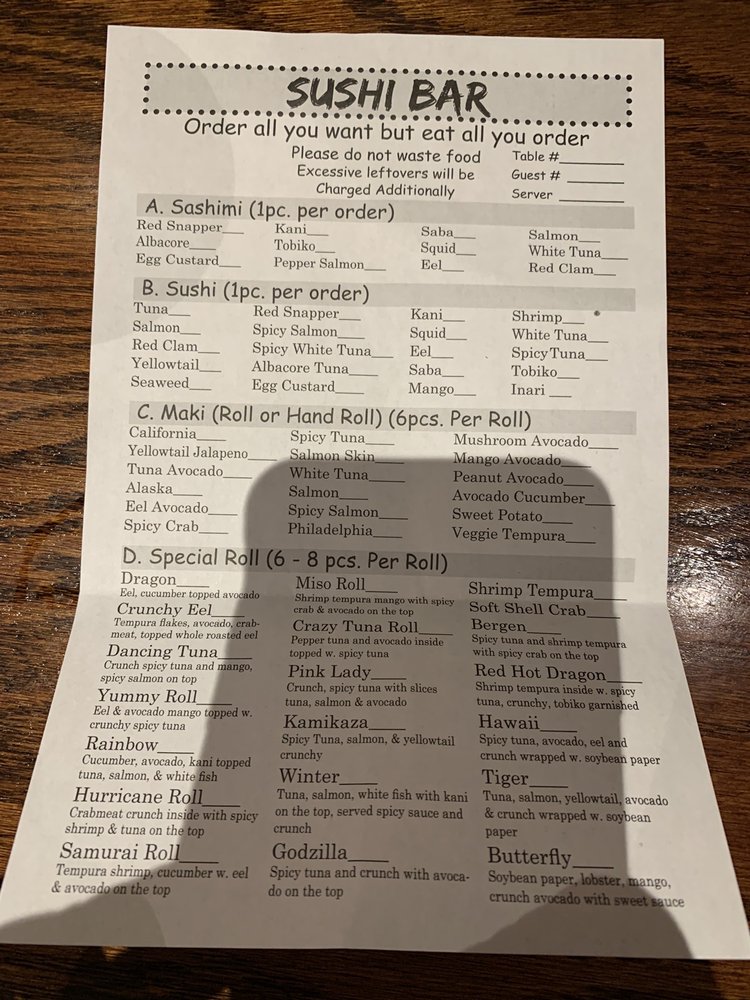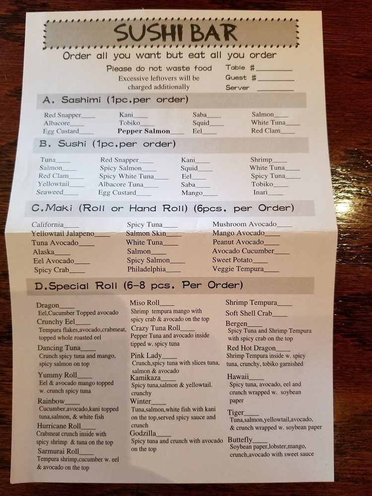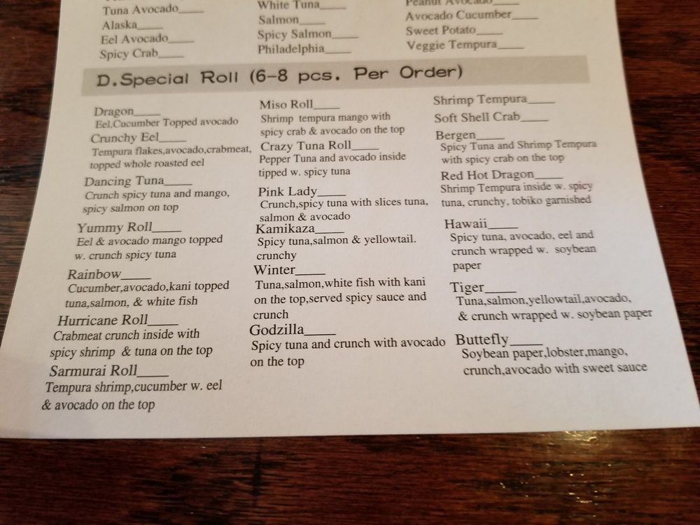 The menu boasts a delightful array of sushi and traditional dishes. Highlights include the Crab Tempura Roll for a satisfying lunch at just $6.50 and the mouthwatering Kamikaze Roll available all day for $7.00. Make sure to try the Beef Steak Teriyaki for a hearty meal at $18.00, or indulge in their fresh sashimi selections like the Tuna Sashimi, priced at $3.00.