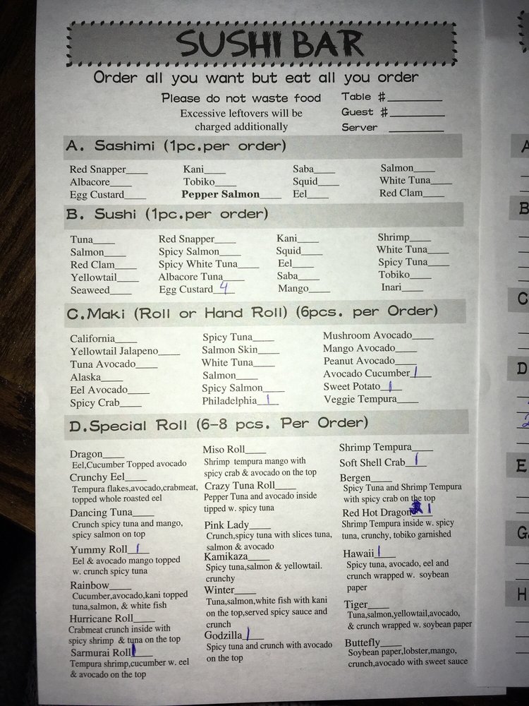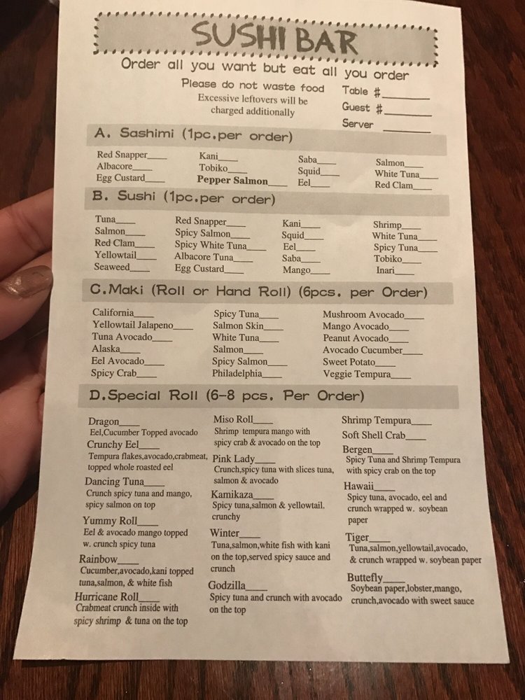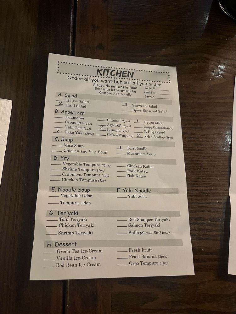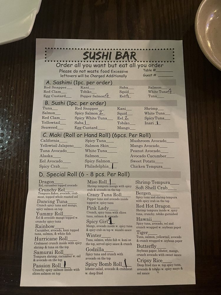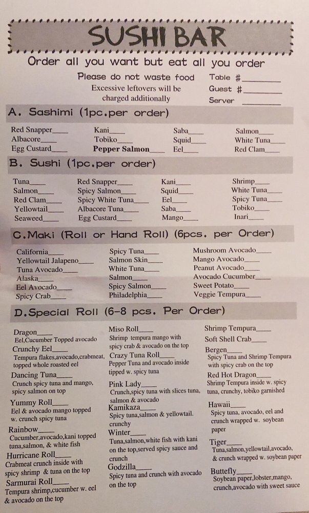 The menu boasts a delightful array of sushi and traditional dishes. Highlights include the Crab Tempura Roll for a satisfying lunch at just $6.50 and the mouthwatering Kamikaze Roll available all day for $7.00. Make sure to try the Beef Steak Teriyaki for a hearty meal at $18.00, or indulge in their fresh sashimi selections like the Tuna Sashimi, priced at $3.00.